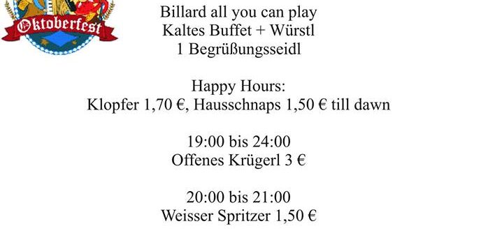 Das jährliche Oktoberfest Im KSC findet fidet statt! mit jeder Menge guter Laune, Billard, Buffet und Biergenuß in Maßen. 😉